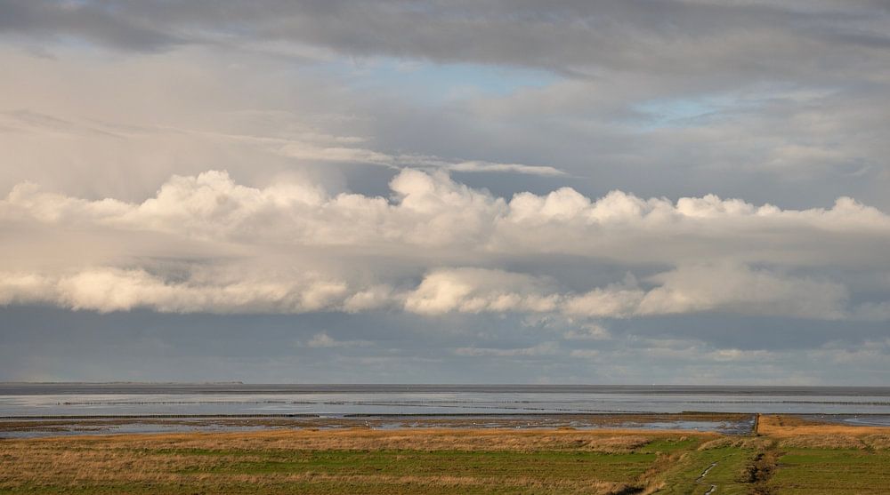 The vast landscape and overwhelming views of the salt marshes and the Wadden coast, seen from the dyke near Westernieland in the province of Groningen. It is autumn and the colours of the land are a warm mixture of green, brown, yellow and red. On the horizon, the contours of the Wadden Islands of Schiermonnikoog, Rottumerplaat and Borkum are visible.