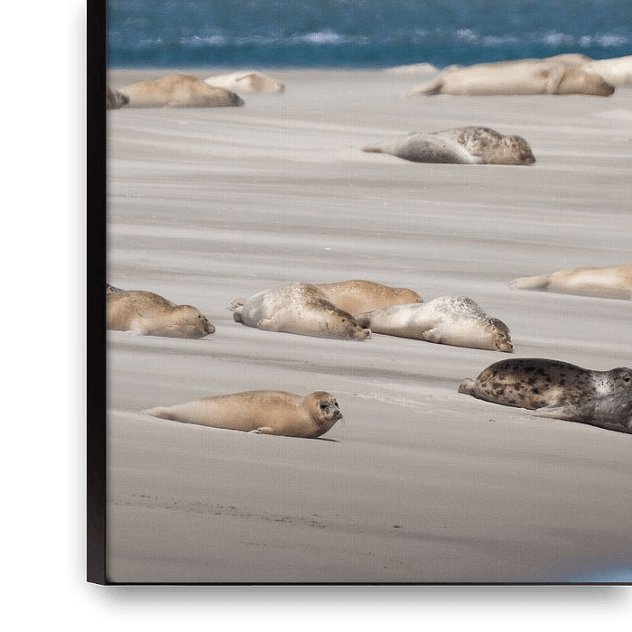 Buy this landscape artwork Sandbank with seals on the mudflats at the Amelandergat by Dennis Wierenga on canvas, ArtFrame, poster and wallpaper, printed on demand in high quality.