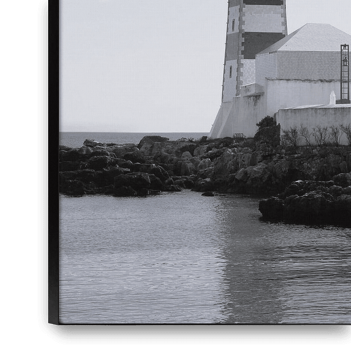 This black-and-white photograph captures the iconic lighthouse of Forte de Santa Marta, a historic fortress on the coast of Cascais. The monochrome palette enhances the graphic lines of the tower and the surrounding architecture, while the play of light and shadow accentuates the robustness of the building and the timeless charm of the…