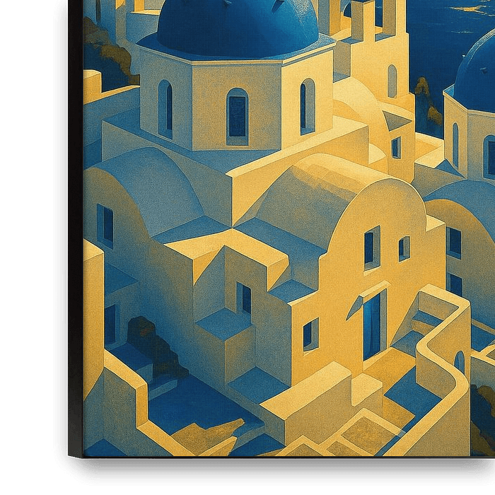 Buy this landscape artwork Santorini Art Deco Poster – Blue Domes and Golden Sunset by Travel Shop on canvas, ArtFrame, poster and wallpaper, printed on demand in high quality.