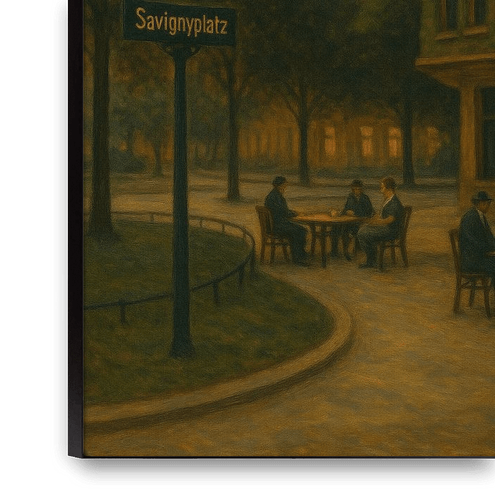 This charming painting brings to life the intellectual and cozy atmosphere of Savignyplatz in the upscale Charlottenburg district. The scene focuses on a quiet corner adjacent to the park, where a small bookstore ('Bücher') casts a warm, inviting light onto the outdoor seating area. The surrounding residential buildings, climbing with…