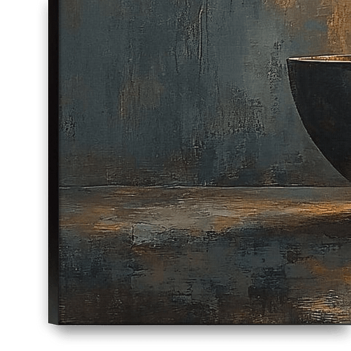Bowls Light - This still life painting shows three shiny, round bowls standing on a rough surface, with the middle bowl subtly illuminated by a warm, glowing light that exudes an atmosphere of calm and warmth, all in an environment that is predominantly dark with textural grey and gold tones.
