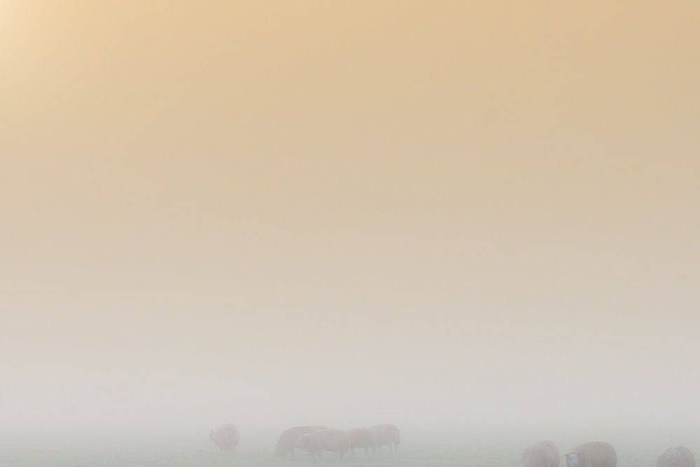 Prachtige opname van een kudde schapen in de mist op een vroege ochtend in een groen weiland in Nederland met een waterig zonnetje in de lucht