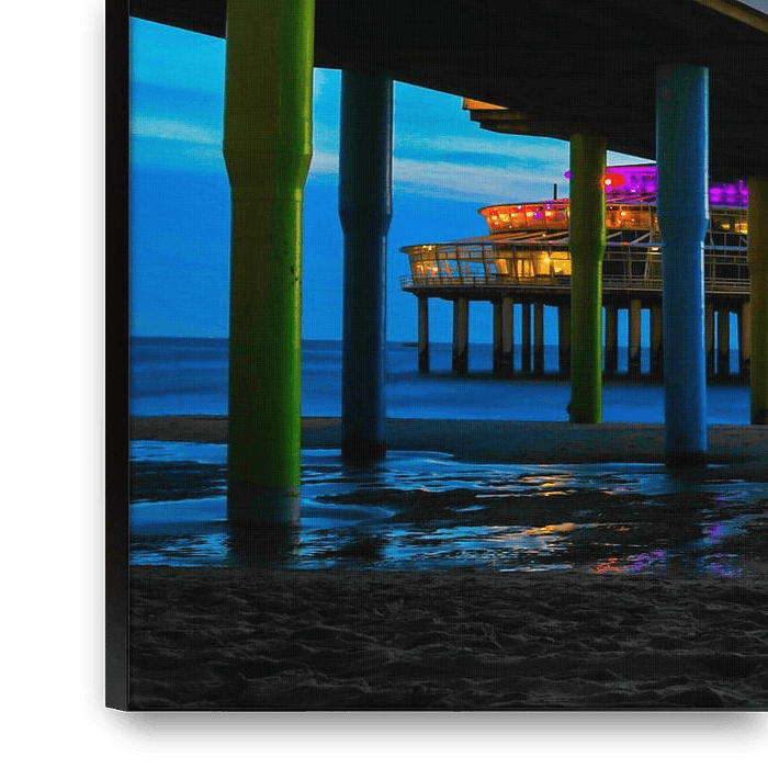 Kleurrijke foto van de Pier/ Boulevard van Scheveningen met lichtgevend reuzenrad boven de zee met Bungeejumpen.
