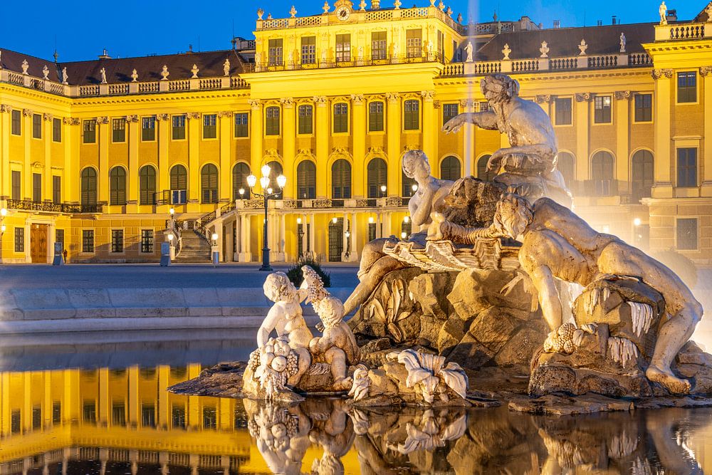 Fountain in the Court of Honor of Schönbrunn Palace at dusk, UNESCO World Heritage Site in Vienna, Austria, Europe |