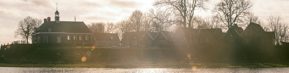 Middelbuurt at the former island of Schokland in the Dutch Zuiderzee now again surrounded by water in The Noordoostpolder, Flevoland, The Netherlands. Wide panoramic photo.