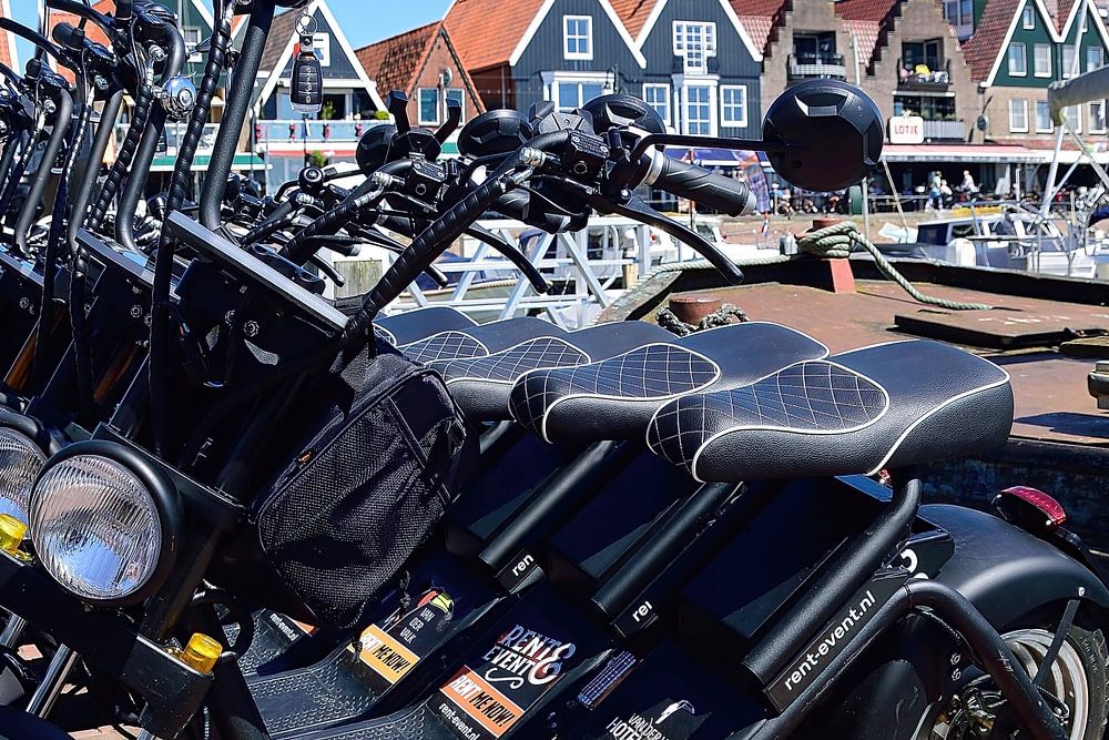 Scooters ready for a day out in the city of Volendam, the Netherlands. We didn't use them but they looked really nice lined up like this, next to the harbour.