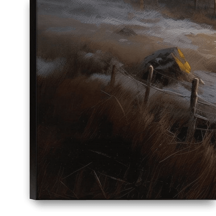 The painting shows an enchanting scene of a remote Scottish cottage, located in the pristine and majestic Scottish Highlands. The winter setting is covered in a soft layer of snow and the landscape has a mysterious and fairy-tale feel to it. The painting exudes a warm and cosy atmosphere, despite the cold winter conditions. It almost…