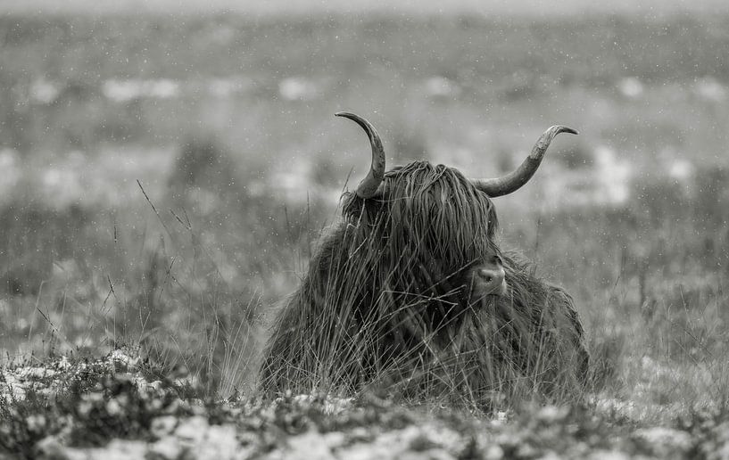 In winter, the heathland of Drenthe transforms into a tranquil, almost fairy-tale landscape. A thin layer of frost or snow covers the purple heather, while the wind has free rein over the open plain. The rugged, reddish-brown coats of the Scottish Highland cattle provide a warm contrast to these cool tones.