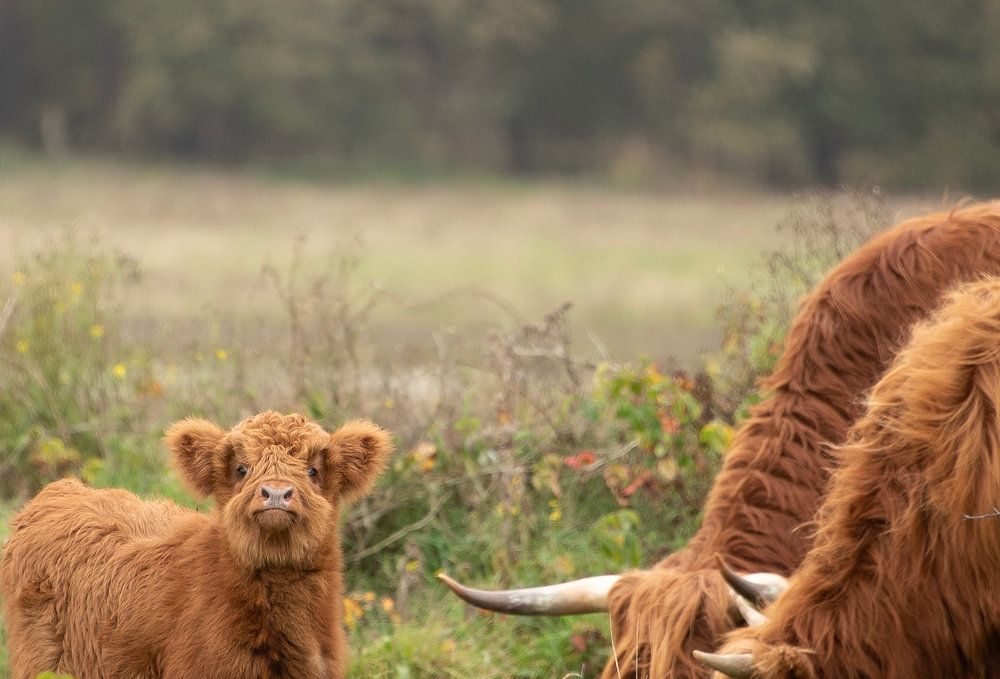 Scottish highlanders graze in the field, the young calf, only a few weeks old, looks around curiously at anything that moves. He sees me standing with my camera and sticks his snout in the air and smells and looks to discover what crazy thing is standing there. Everything is new to this little one. The photo was taken in the province of North Brabant in the Netherlands.