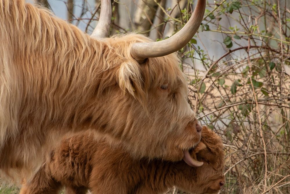 A blonde Scottish Highlander looks after her calf with great love and devotion, they are inseparable and the calf is safe with mum. When the whole herd is together, the calves are well protected by all and are safe from outside danger. This herd lives in a nature reserve in North Brabant in the Netherlands and is managed by Natuurmonumenten.
