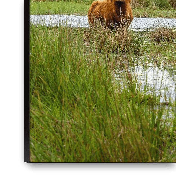 Buy this landscape artwork Scottish Highlander in the Drenthe countryside by Mark de Weger on canvas, ArtFrame, poster and wallpaper, printed on demand in high quality.