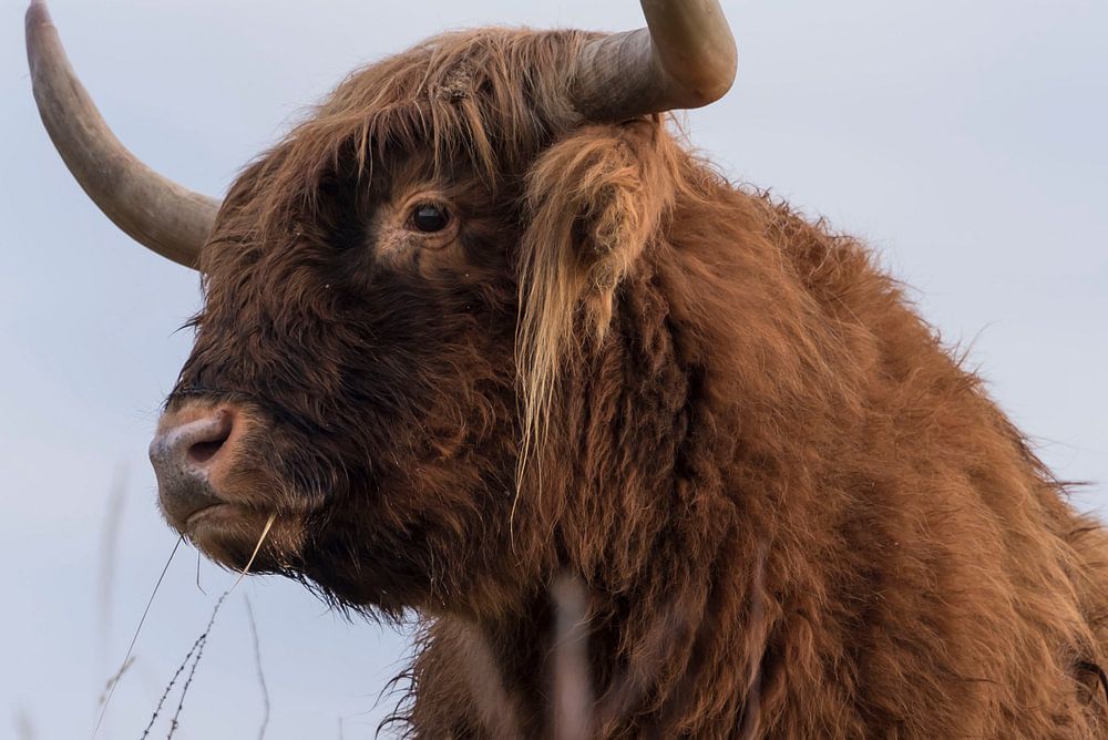 A tough, robust, curious Scottish Highlander looks into the distance, in the Dintelse Gorzen nature reserve in Noord-Brabant in the Netherlands.