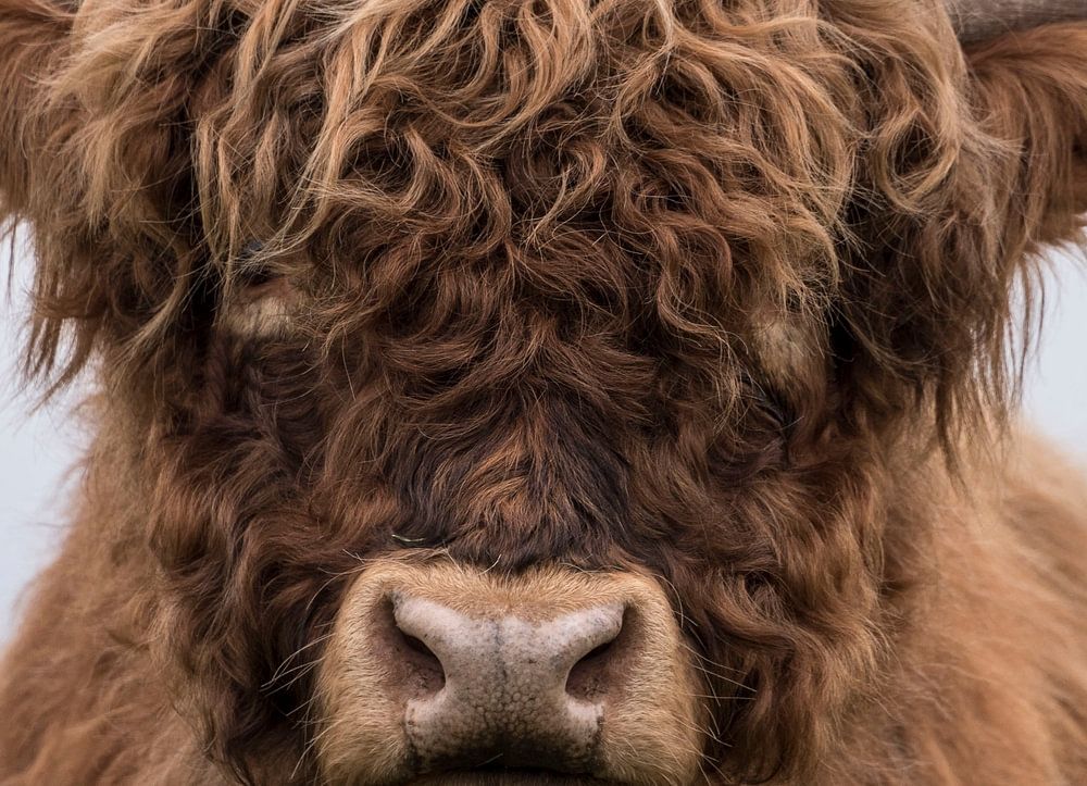 A Scottish Highlander stands quietly grazing and while looking up he has another dandelion in his mouth. This Scottish Highlander lives in Slikken van Flakkee nature reserve on the island of Goeree-Overflakkee in the province of South Holland in the Netherlands.