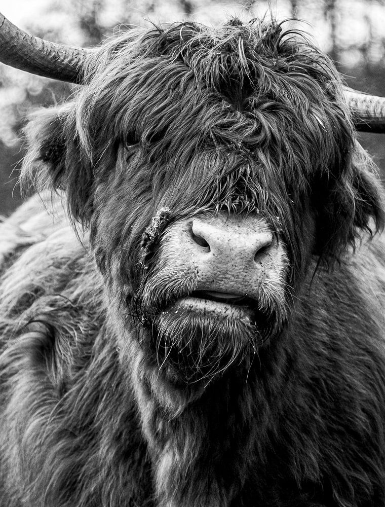 Scottish Highlander, animal photo in wintertime. Scottish Highlanders in the Netherlands. Cow / Beef species. The animal is standing in the forest and has eye contact. Black and white photo of animal. Orange thick coat. And nice antlers. Photography, nature photography, animal photography.