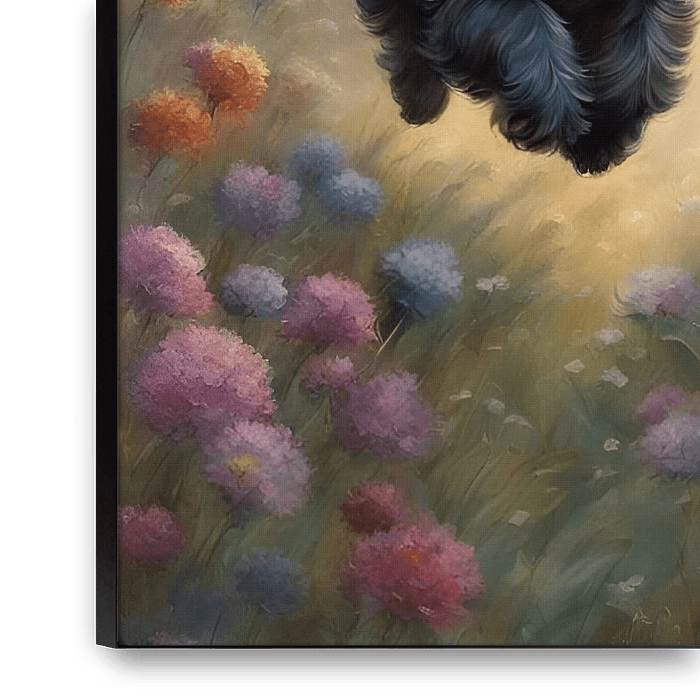 This vibrant and whimsical digital art piece captures the joy of an Scottish Terrier playing in a field of wildflowers. The dog's playful expression and energetic body language are perfectly captured, and the bright and cheerful colors of the flowers create a sense of happiness and carefree fun.