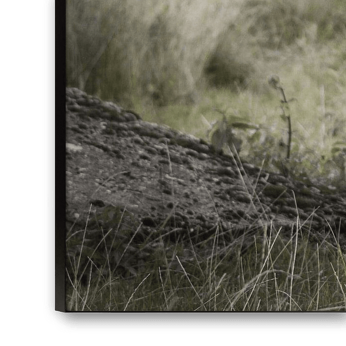 Photo of a Scottish highlander cow, photographed from the front. The cow stands relaxed in the landscape. To the side is some debris. A natural frame surrounds the photo.