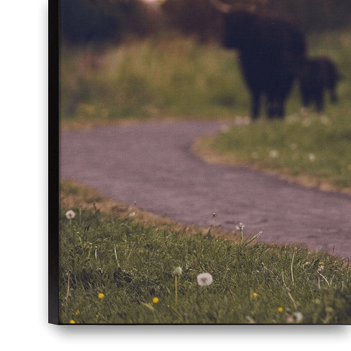An atmospheric image of a Scottish highlander grazing during sunset along the path in the Rasterhoff park in Sneek. In the background are two adult animals with their calves.