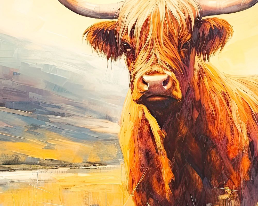 An unusual portrait painting of a Scottish Highlander. The familiar farm animal stands in a wild mountain landscape and is enveloped in the golden light of the sunset. The animal looks straight at the viewer. The painting is painted in a modern, semi-abstract style and has a beautiful colour palette.