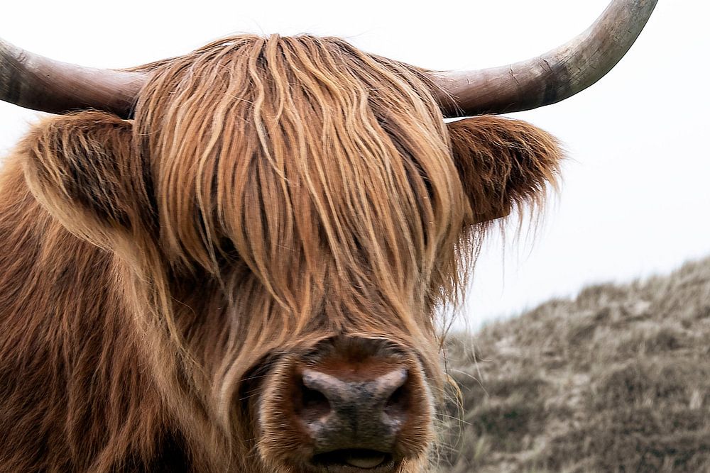 Scottish Highlanders are released into the dunes to maintain the dune landscape in a natural way. I photographed her, two meters away, lying on my back, while she looked at me chewing quietly.