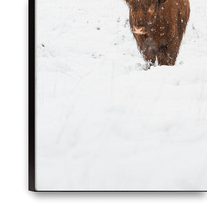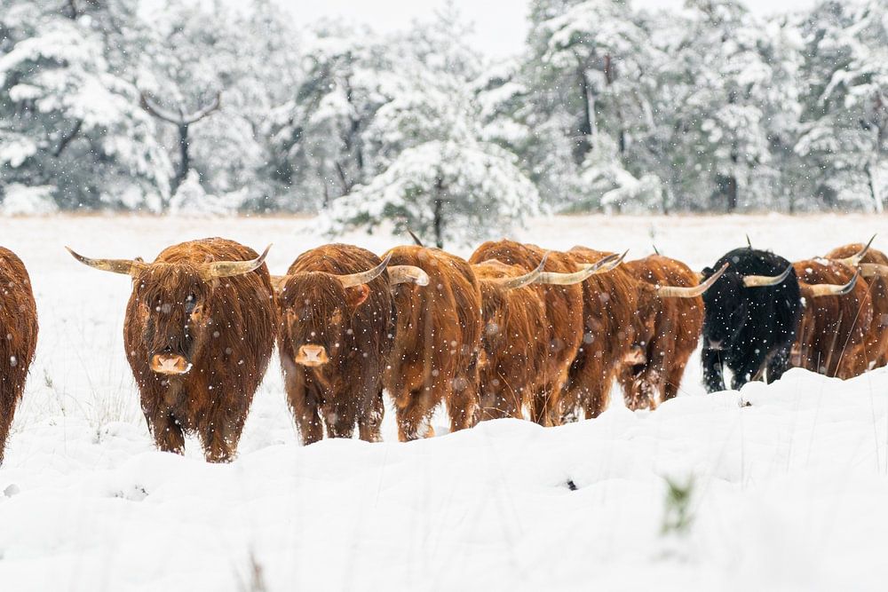 A beautiful herd of Scottish highlanders went in line chasing each other through the snow on the beautiful Deeler forest