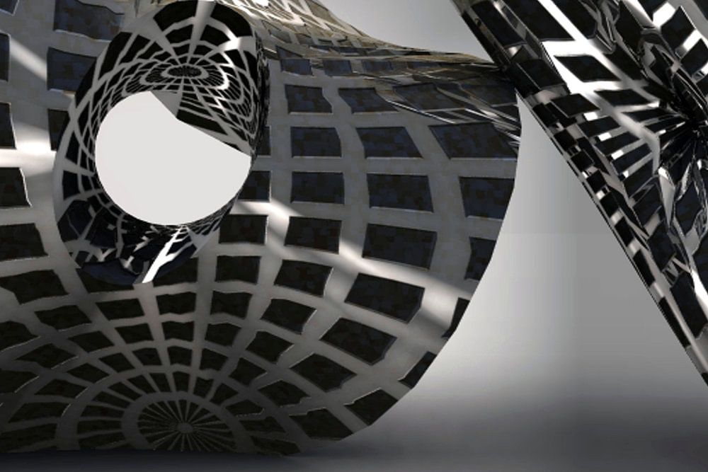 This extraordinary digital poster, created with MAXON Cinema 4D, transports the viewer into a world in which mathematics, art and digital aesthetics merge in fascinating harmony. The two abstract objects at the centre of the motif look like futuristic sculptures - shiny metallic, partly reflective, partly opaque. Their surface is covered with a regular grid pattern, which is distorted by the curvature and folding of the shapes and lends the overall picture enormous depth and dynamism.