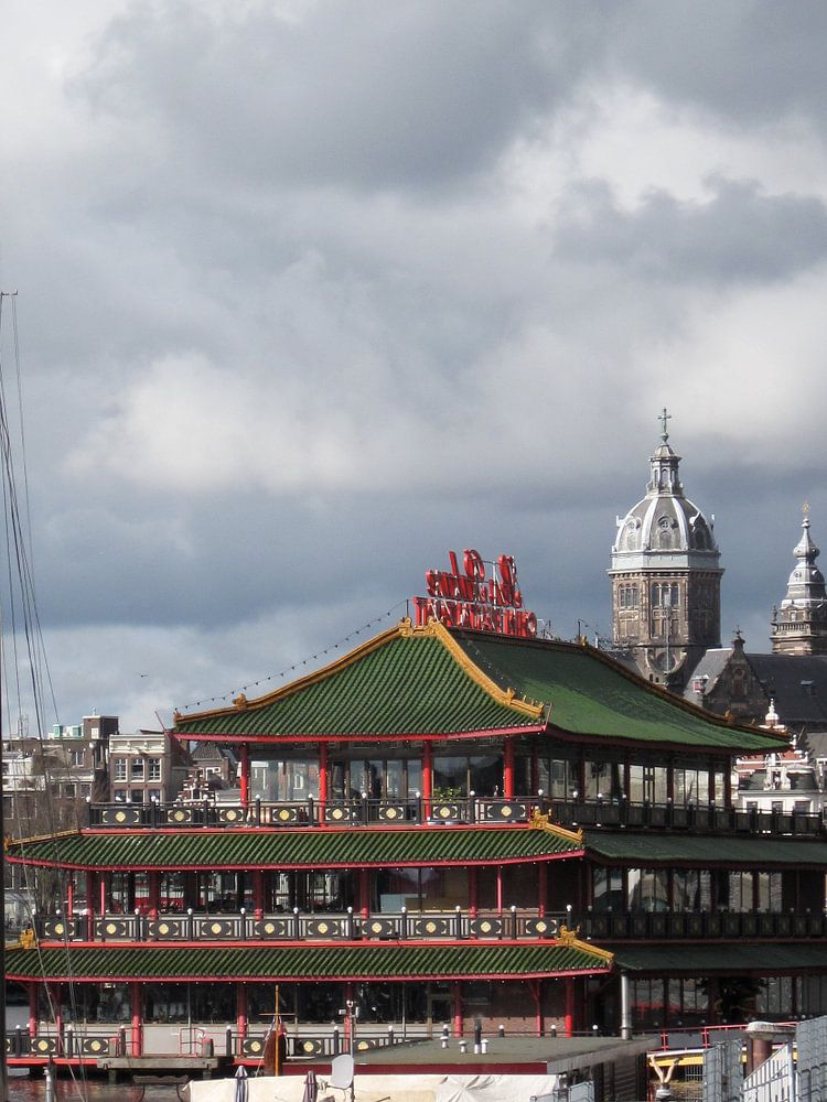 Sea Palace Restaurant; drijvend Chinees-Indonesisch Restaurant in het IJ van Amsterdam vlakbij het Centraal Station met op de achtergrond de Nicolaas Kerk.