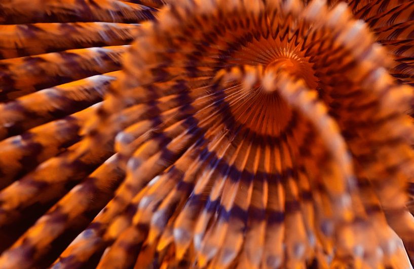An abstract and captivating close-up of a sea anemone, revealing its mesmerizing radial structure and flowing tentacles. Warm shades of orange, amber, and gold radiate outward in a hypnotic pattern, creating a strong sense of movement and natural rhythm. The image blurs the line between realism and abstraction, highlighting the…