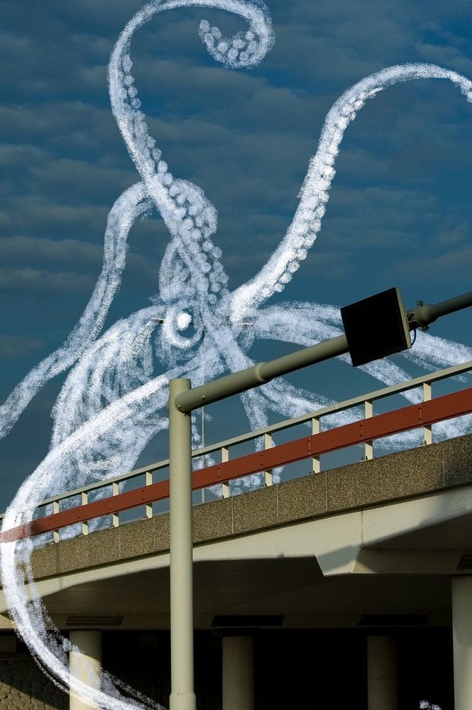 About "Sea creatures (octopus) in the sky - combination of a photo with white chalk illustration"
