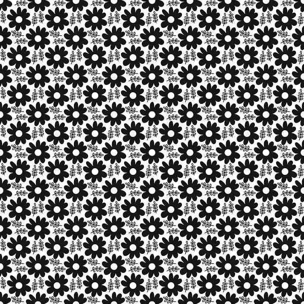 Seamless black and white pattern of stylized flowers and tiny leaves.