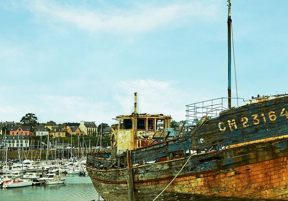 An old fishing port, Camaret-sur-Mer in France. nowadays mainly a marina. along the shore a few old half decayed wooden ships. these are here to give various animals a place to live. sailing, the boats can no longer sail. slowly but surely these boats are declining.