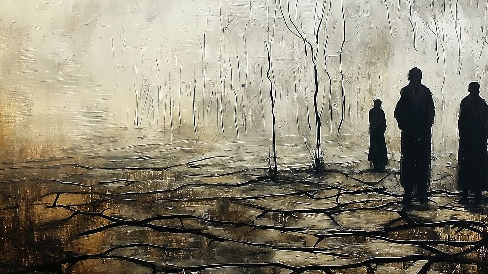 A powerful illustration shows three refugees walking on dry, cracked ground, hoping to start a new life after being forced to leave their homeland. Their determined steps and the vast, inhospitable landscape convey an impressive mixture of despair and hope. The image illuminates the indefatigable will to survive and strive for a better future, despite the hardships and deprivations that await them along the way.