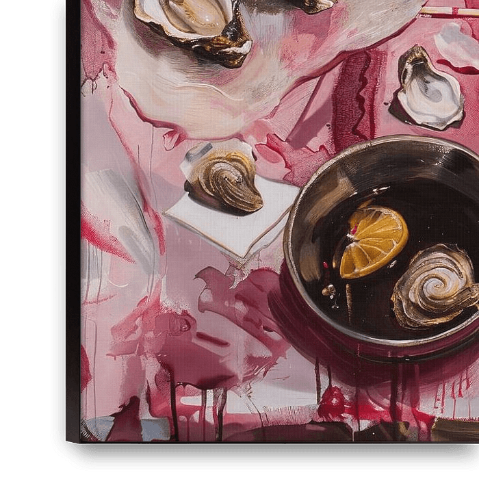 Full of symbolism and sensory seduction, this tantalising still life shows an elegantly set table full of oysters, lemons and red wine, captured in an expressive, almost sensual painting style. The deep hues of the wine red literally drip over the pink tablecloth, as if emotions have poured onto the canvas. The paint is glossy and fluid…