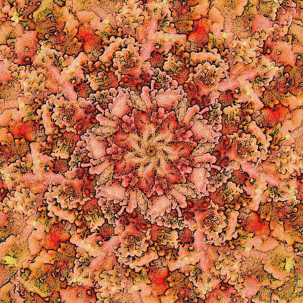 Rotating seven digital copies of that photo and overlaying them transparently created this geometric image. As a final edit, I added a 3d effect to it, giving the effect of blobs of paint that have just solidified.