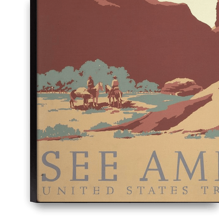 Poster for the United States Travel Bureau promoting tourism, showing two cowboys on horseback by stream near desert rock formation.