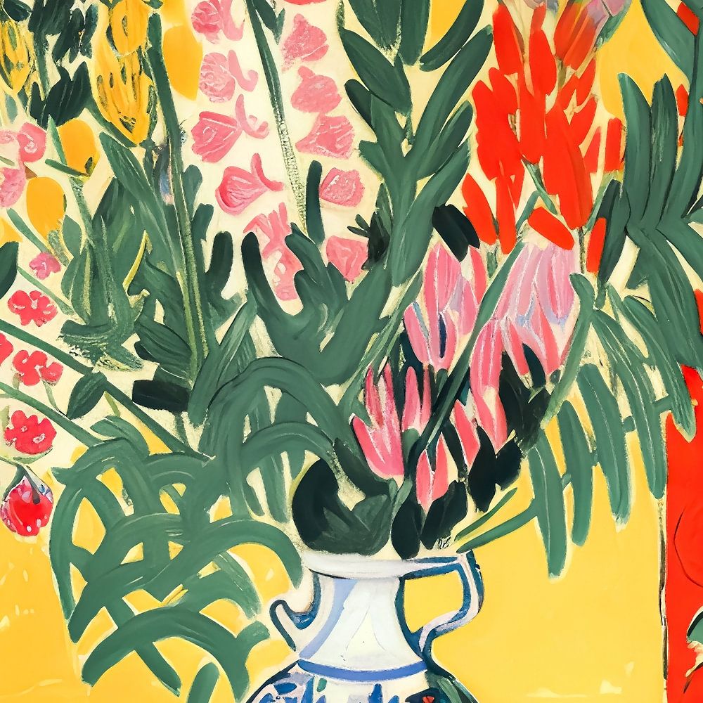 A semi-abstract painting of a summer bouquet of flowers in front of an open window. The golden yellow sunlight coming in through the window creates a cheerful summer atmosphere. the bouquet of wild flowers is bright. On the windowsill are some citrus fruits. The work is available in different sizes and can be printed on various materials. With this work, you can bring summer into your home!