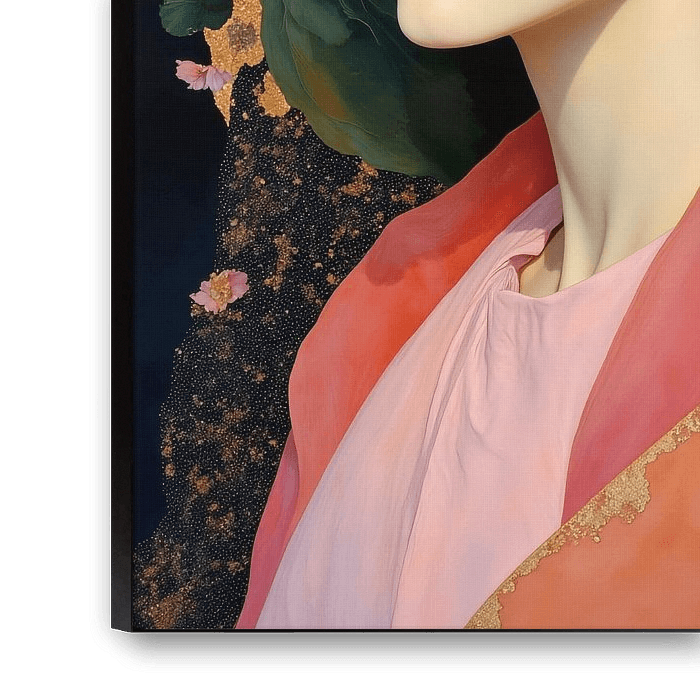 Sensual elegance - portrait painting with flowers and abstract shapes in contemporary colours - Show your courage with this modern and abstract work of art, which is reminiscent of the great works of the old masters. Choose the size and material yourself from a wealth of options. Turn your home into a refuge of art, just the way you like it!