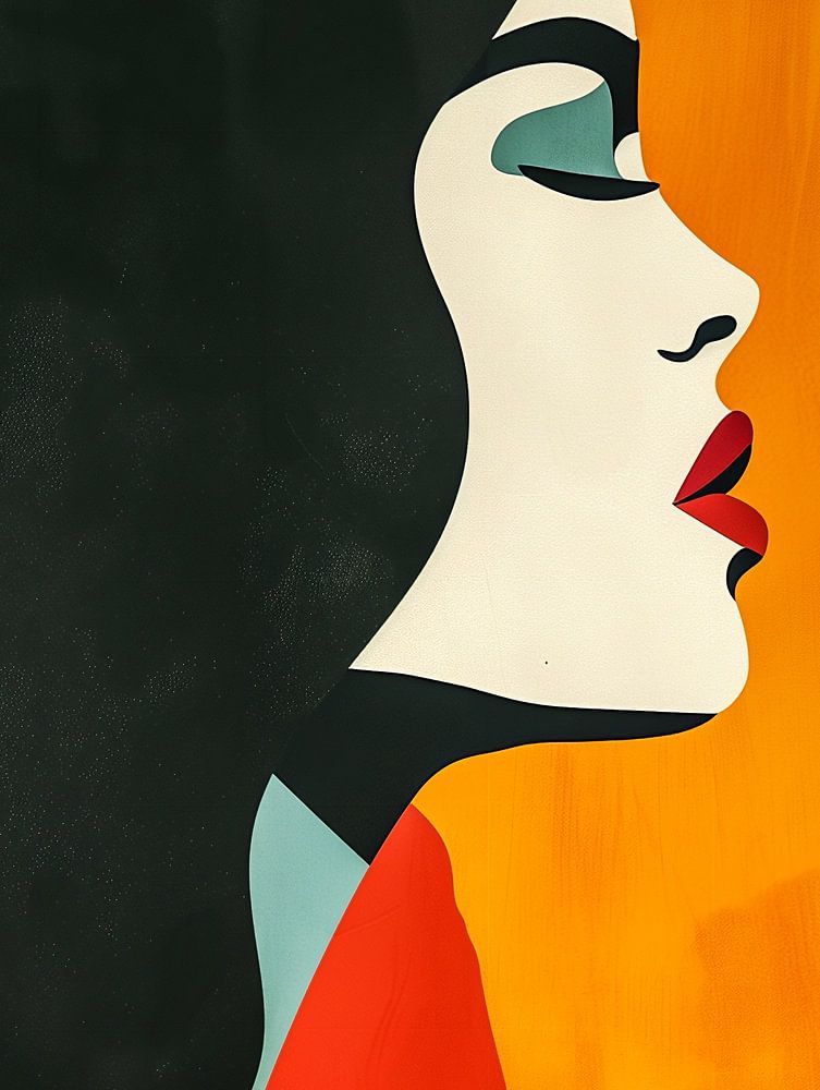 This contemporary portert captures the essence of feminine grace in an abstract silhouette painted in muted, dark pastel colours. The artwork, two-dimensional and minimalist, offers an understated yet powerful representation of the female silhouette.
