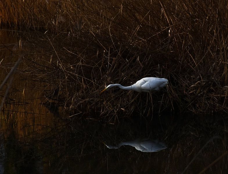 A tranquil portrait of a Great White Egret, perfectly reflected in the rippling water. The warm autumn tones of the background form a beautiful contrast with the bright white plumage. An image that radiates tranquillity and natural balance, ideal for a modern interior.