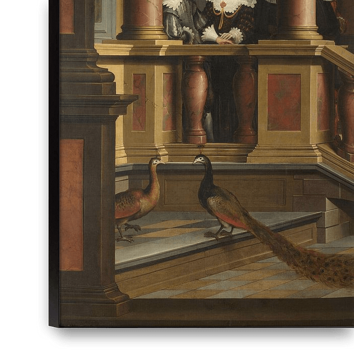 Seven-part room painting: An outdoor staircase, Dirck van Delen, 1630 - 1632 oil on canvas, h 309cm × w 122cm Part of a seven-part room painting in five pieces depicting an interior, two galleries and two outdoor staircases, populated with numerous persons. This is the left half of the depiction of an outdoor staircase. Near the staircase are several elegant persons, at the bottom two peacocks.