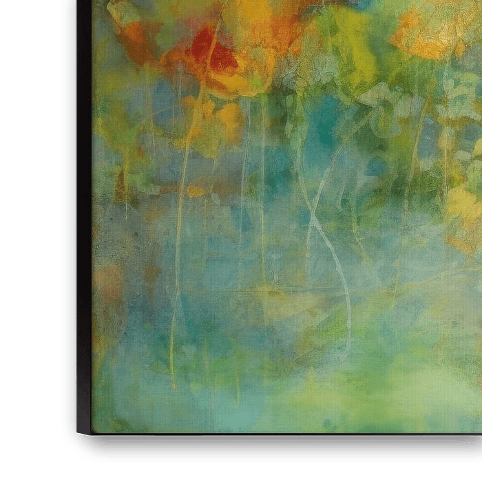 An abstract painting in green, yellow, orange, and turquoise with flowing shapes exudes freshness and energy. A timeless abstract work that evokes a sense of harmony and optimism.