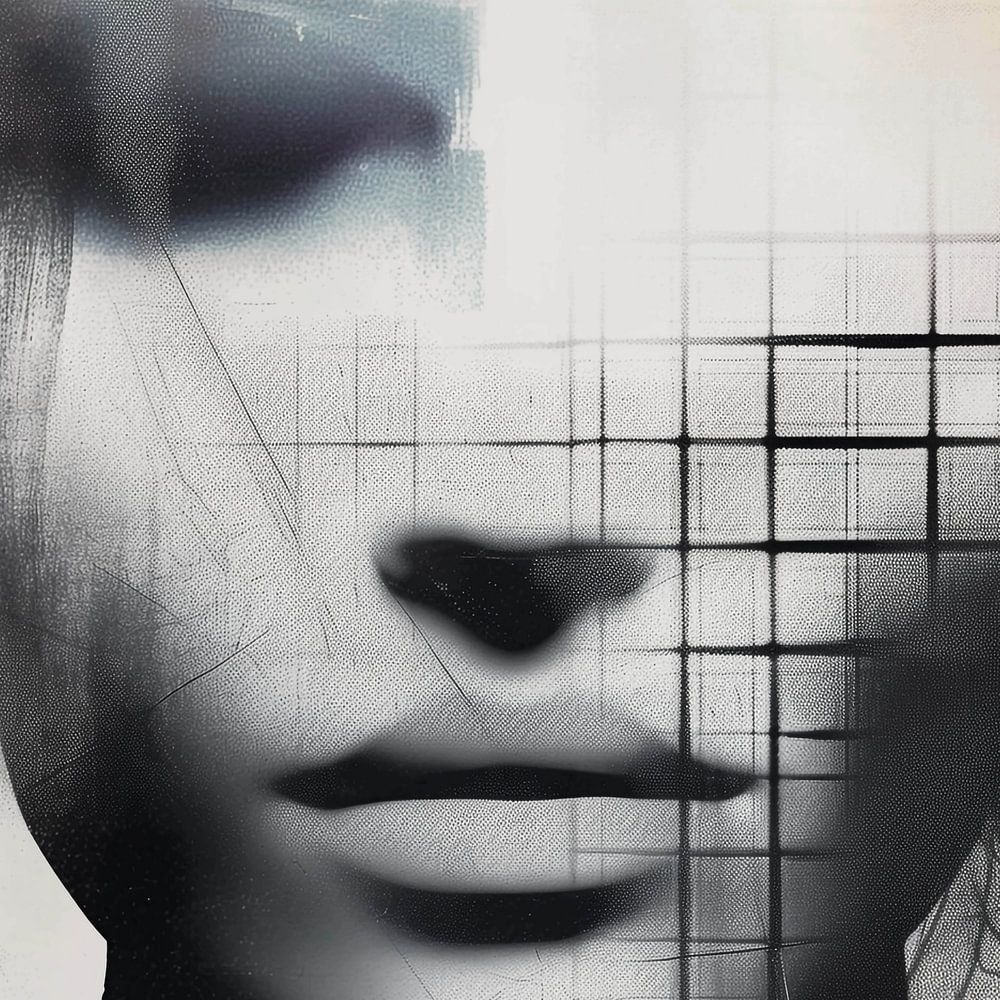 Penetrating portrait of a female figure executed in a monochrome colour scheme consisting mainly of black and white tones, creating a dramatic and mysterious atmosphere. The figure's facial features are partially obscured by a grid that gives an alienating effect and invites the viewer to think more deeply about the subject's identity and emotions. The blurred and hazy background with subtle natural elements, such as the silhouettes of trees, adds a dreamy and sometimes ominous element. This artwork plays with the theme of perception and the fragmentation of the self.
