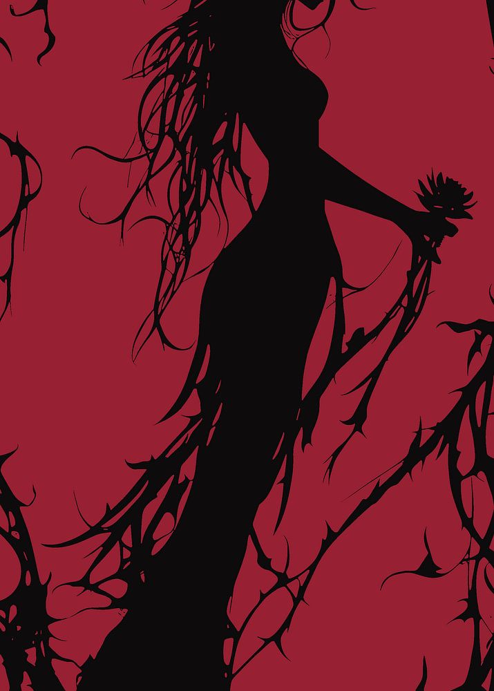 The silhouette of a mystical woman with flowing hair stands out in high contrast against a deep red background. Her slender figure is surrounded by thorny tendrils that create a mysterious, almost threatening atmosphere. In her hand she holds a flower whose shape is reminiscent of the surrounding thorns. The skilful combination of light and shadow lends the motif a dramatic depth and invites interpretation. The scene radiates a dark elegance and combines romance with a touch of melancholy.