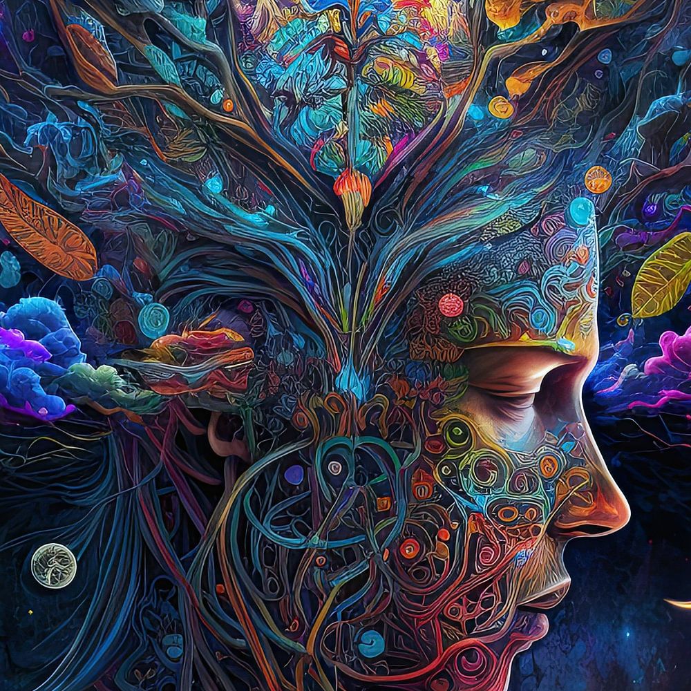 This artwork, in a square format, captures the essence and depth of a shamanic ayahuasca ritual in an impressive and mesmerising way.