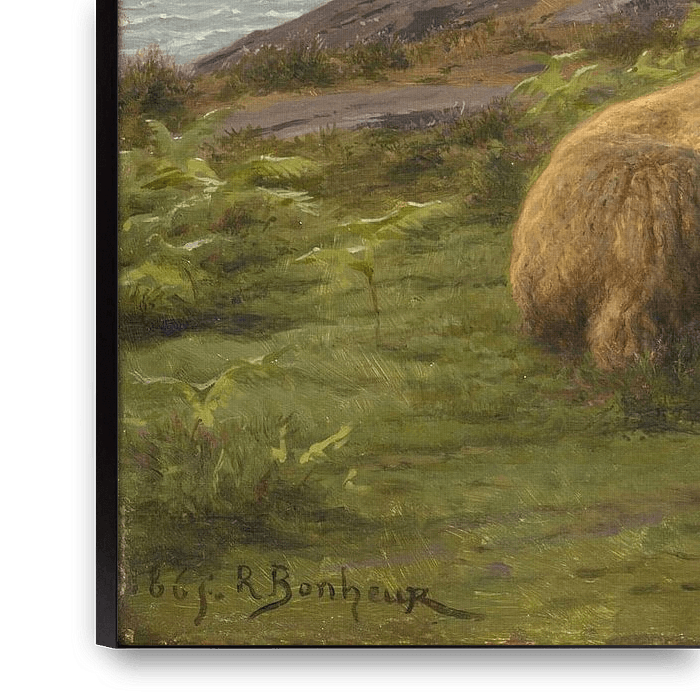 Rosa Bonheur created “Sheep by the Sea” following a trip through the Scottish Highlands in the summer of 1855. In painting this complacent flock of sheep settled in a meadow near a body of water, Bonheur captured a placid moment. “Sheep by the Sea” demonstrates the artist’s commitment to direct observation from nature.