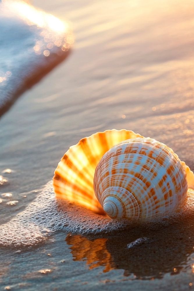 A gentle ray of sunshine kisses the wave while an artistically patterned shell lingers peacefully on the beach. Its vibrant colours catch the light and reflect the gentle beauty of the coast. The gentle lapping of the water tells stories of distant oceans and endless expanses. A moment of tranquillity and grace that soothes the soul.