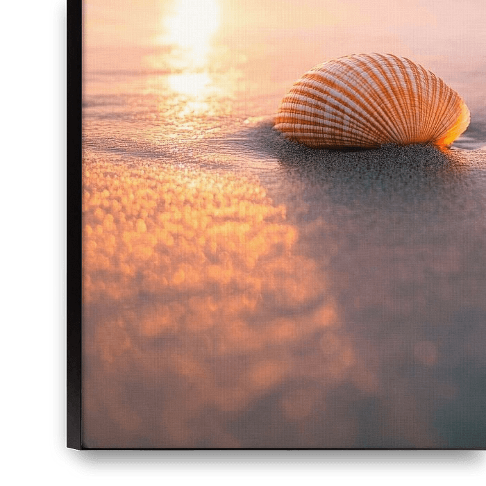 Gentle waves play around a shimmering shell that glows in soft shades of colour. The sunset conjures up golden reflections on the smooth surface of the water, while the subtle breeze brings with it the scent of the sea. A moment of tranquillity, captured between heaven and earth, that invites you to dream.