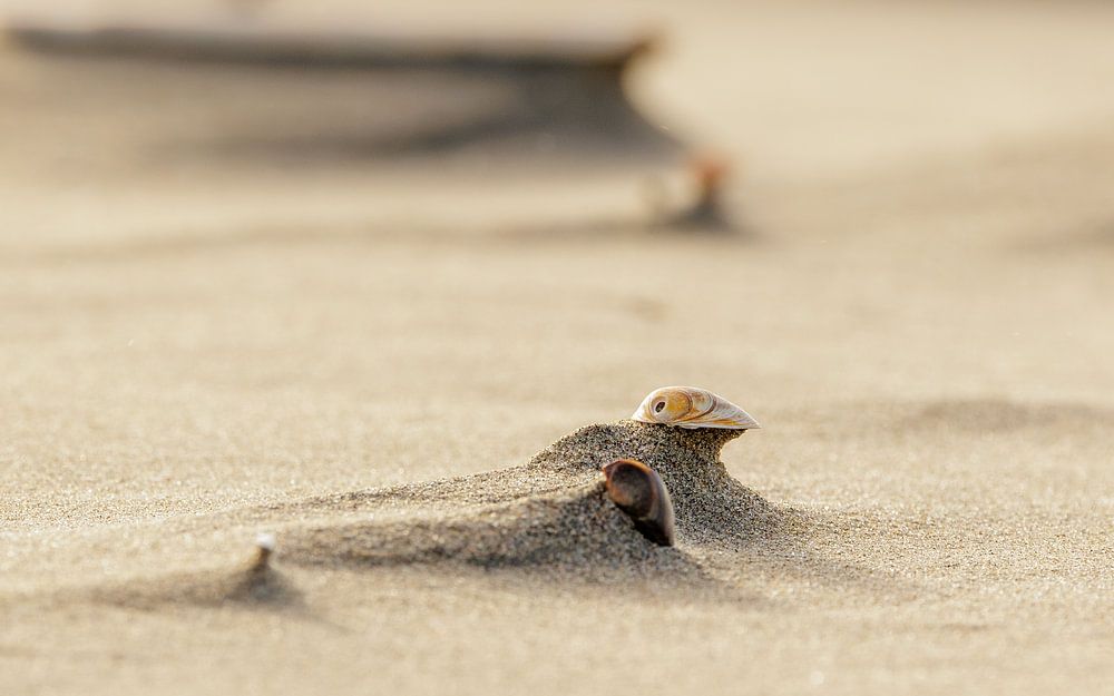 The wind dusts the sand towards the dunes. These shells are holding their own on Dutch beaches for now.