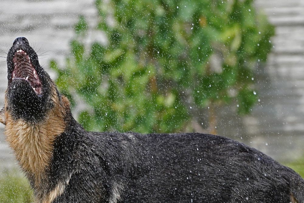 About "Shepherd dog (puppy) playing with water from garden hose"