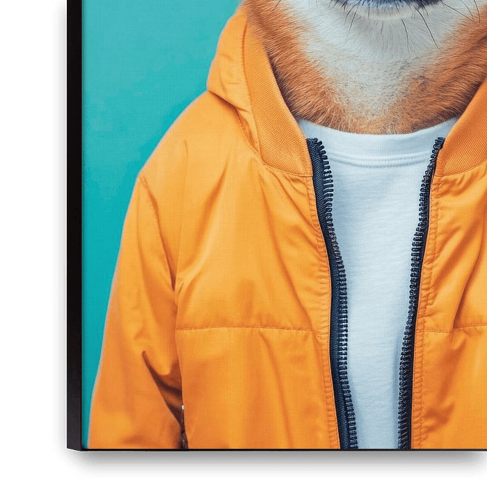 A Shiba Inu with a charming grin and lively, silky fur radiates an unmistakable personality. In a stylish, bright orange jacket combined with casual white, he embodies the perfect mix of coolness and loyalty. His inquisitive look gives the image a playful touch that is simply irresistible.